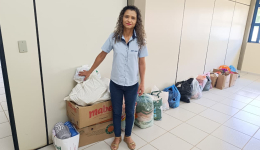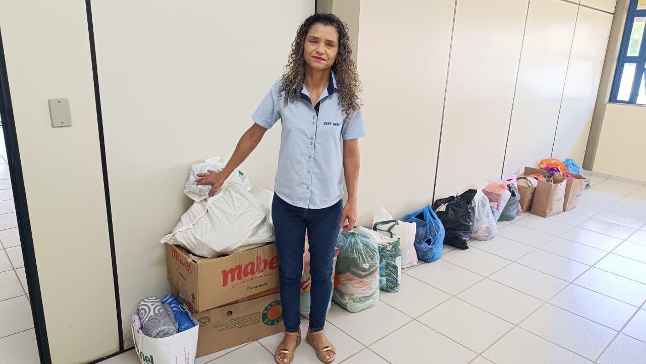 Entre os itens que podem ser doados estão roupas usadas em bom estado, calçados, alimentos não perecíveis, água, leite e produtos de limpeza. No entanto, a maior necessidade no momento são itens de higiene pessoal, como sabonete e shampoo.Juliana Cristina Borges, assistente administrativa do Sest Senat. Foto: Caio César