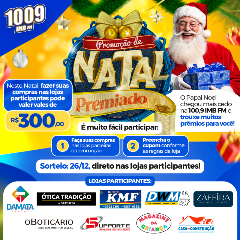 PROMOÇÃO DIA DAS CRIANÇAS 100,9 IMB FM A 100,9 IMB FM VAI DEIXAR O DIA DAS CRIANÇAS AINDA MAIS ESPECIAL! VOCÊ PODE GANHAR *VALE COMPRAS DE R$ 250,00* PARA GASTAR NAS LOJAS PARTICIPANTES. 👉 PARA PARTICIPAR É FÁCIL: 1. VÁ ATÉ UMA DAS LOJAS DA PROMOÇÃO 2. PREENCHA SEU CUPOM CONFORME AS REGRAS DA LOJA. 📅 O SORTEIO ACONTECE NO DIA *13 DE OUTUBRO*, DIRETO NAS LOJAS PARTICIPANTES. NÃO PERCA! CONCORRA E COMEMORE O DIA DAS CRIANÇAS COM A 100,9 IMB FM! OFERECIMENTO MAGAZINE DA CRIANÇA RUA PRESIDENTE OLEGÁRIO MACIEL 357. MEGA ÚTIL MIX PRAÇA JUCA FREDERICO 20 MEGA ÚTIL LOJA DE VARIEDADES RUA PRESIDENTE OLEGÁRIO MACIEL 539 DENTE DE LEÃO ODONTOLOGIA INTEGRADA RUA ALEXANDRE GONDIN, 25 VILA CALÇADOS RUA PRESIDENTE OLEGÁRIO MACIEL , 176